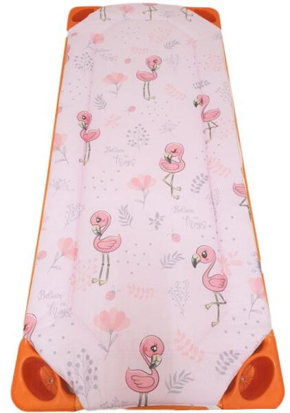Flamingós ovis derékalj Óvodai fektetőre való, vatelinnel ( 100% poliészter ) bélelt "ovis bélelt lepedő". A derékalj mind a 4 sarkán gumi rögzítőpánttal rendelkezik, így a felhelyezést követően fixálhatjuk a derékaljat a kiságyhoz, ezzel biztosítva, hogy a gyerkőc forgolódás során ne tudja maga alá gyűrni a lepedőt. Anyagfelhasználásának köszönhetően, kényelmes, kellemes pihenést biztosít ovis gyermekednek, illetve megvédi a padló felől érkező esetleges hideg levegőtől. Felső része puha pamutvászonból, alsó része kevertszálas pamutból készül. Rendkívül jó nedvszívó képességű, emellett gyorsan szárad, jó a rugalmassága, nem gyűrődik. Mérete: 130x56 cm. Mosógépben 40°C-on mosható.